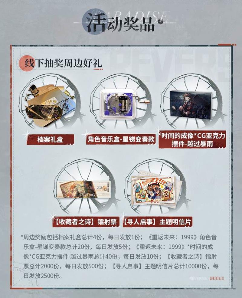 除了上述活动,上海美罗城店还将在 5 月 15 日至 18 日期间举办限定中庭打卡活动。玩家无需预约即可前往参加,即使门店的试玩活动预约名额已满,也能参与中庭打卡活动,享受游戏乐趣。活动要求玩家完成指定的互动任务,并在社交平台分享带有 #重返未来二周年# 话题的活动现场照片或视频,即可参与现场抽奖,赢取丰富周边好礼。周边奖品包括档案礼盒、角色音乐盒、时间的成像 CG 亚克力摆件、镭射票和主题明信片等,每种奖品都有明确的发放数量和规则,确保活动的公平性和趣味性。