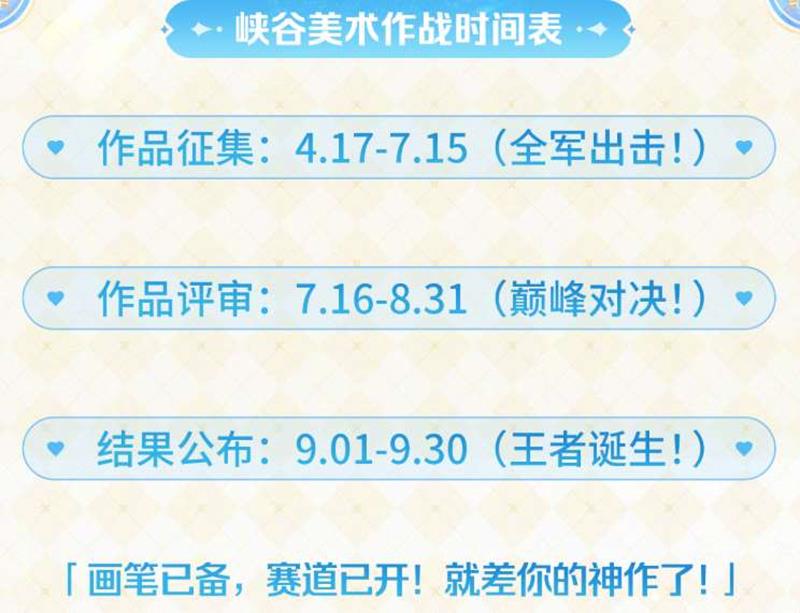 报名步骤:登录【腾讯游戏学堂2025腾讯游戏创作大赛-《王者荣耀》美术设计赛区】页面。完成报名信息填写。在参赛时间截止前选择1-2个游戏赛道创作及提交作品。