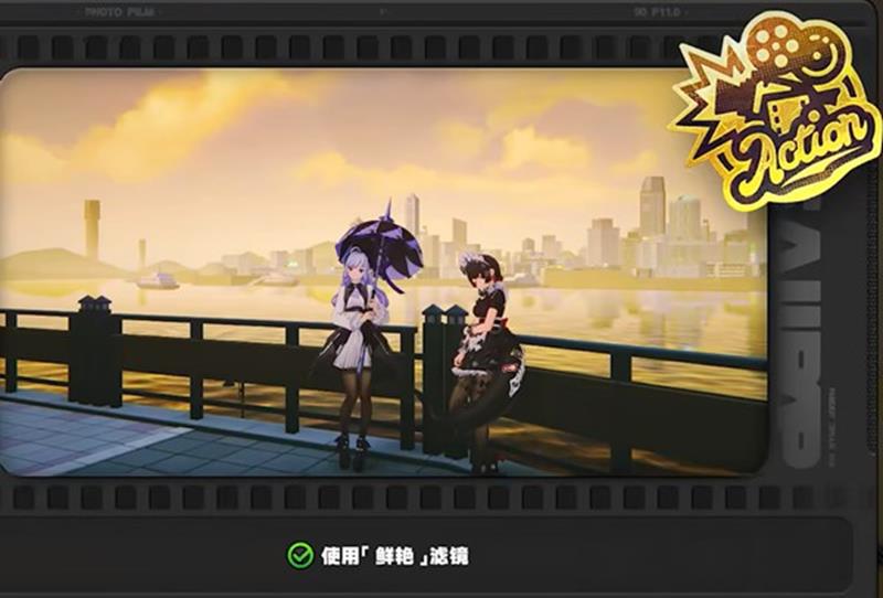本次任务要求使用“鲜艳”滤镜,同时确保两名角色同框。选择滤镜后对准目标,确认构图无误后完成拍摄。