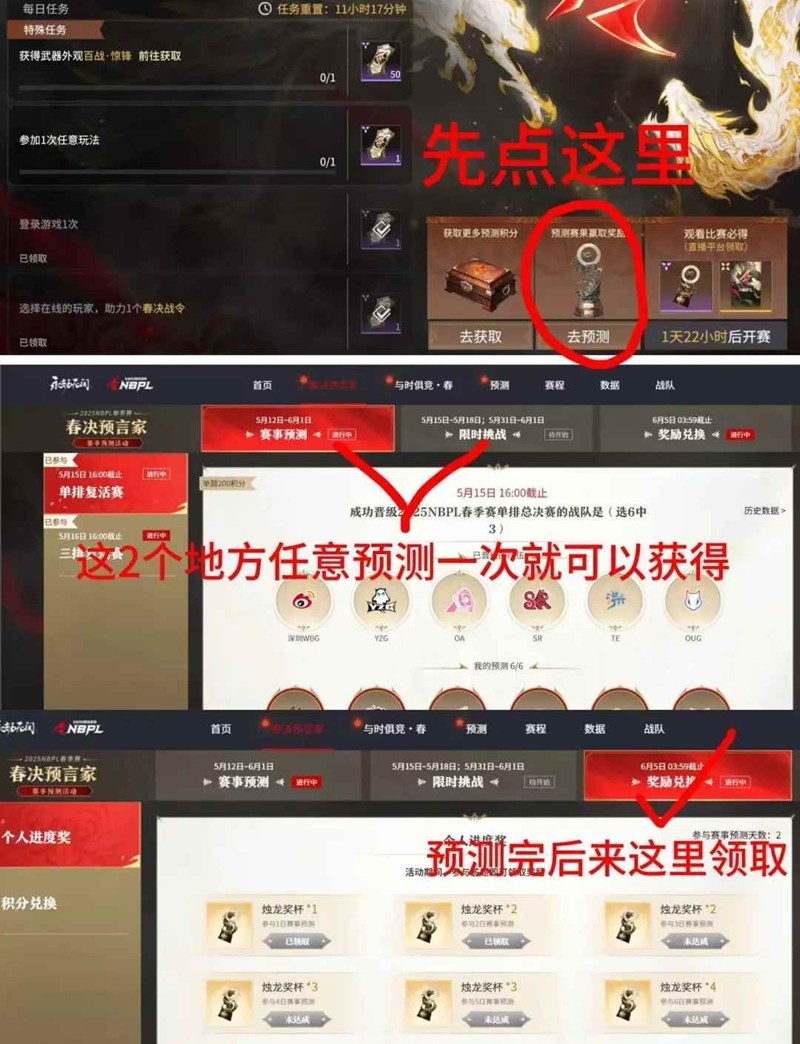 注意事项:首先如果你只拿成名在望活动的礼包,5个宝箱,5个赛事礼包,小狗表情,鸭舌帽及动作的话,每天观看比赛几分钟并且完成成名在望的基本任务,肯定所有的都能拿到。预测不管是对还是错都能拿到。