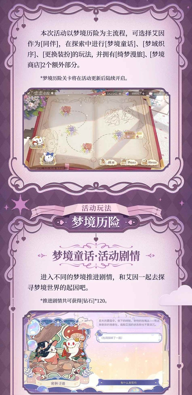 5月18日9:30 - 5月25日05:00,通过[主界面]右下角-进入[恋恋奇踪·巧恋梦旅],和艾因一起探索梦中世界。