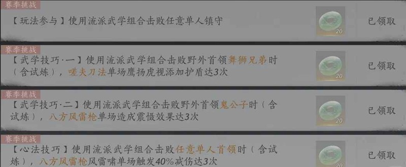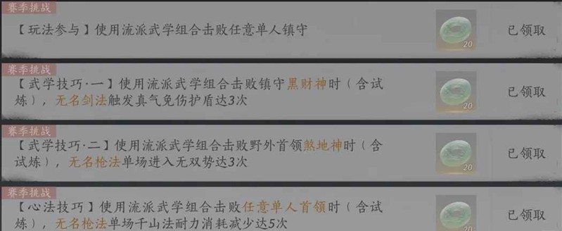 1.打三把镇守道主,用武学技挂流血,换枪武学技达到8层,再用剑特殊技引爆流血,单场内两个任务都需要三次