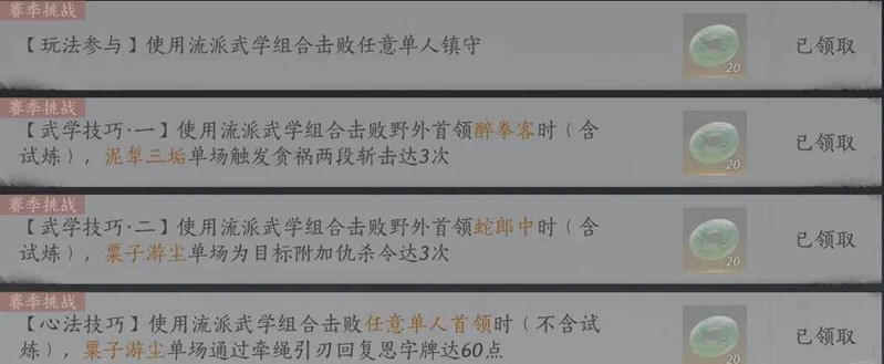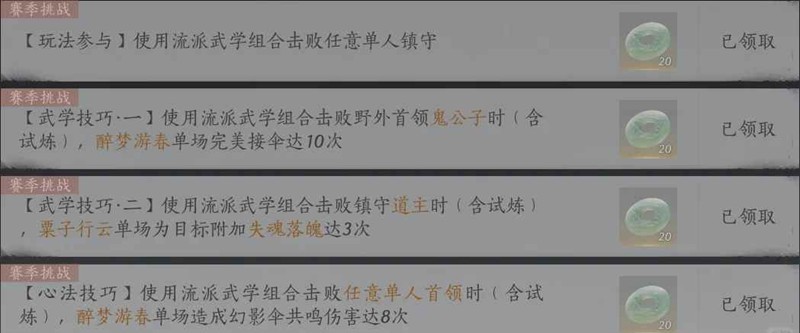 1.打三次镇守道主,等道主气揭完美接伞八次(技能图标亮起来就是完美时机),同时完成失魂落魄三次,即绳镖武学技后自动蓄力,二段蓄力后重击释放即可