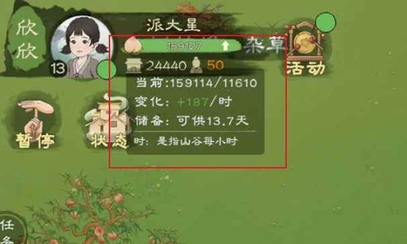 2.农田驻守,派遣村民前往驻守未成熟的农作物,如图二右下角所示,此村民每小时(游戏内时间)会带来一定数额的饱食度。