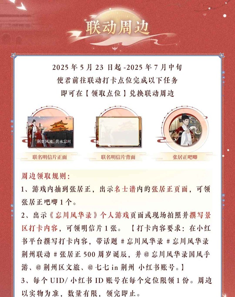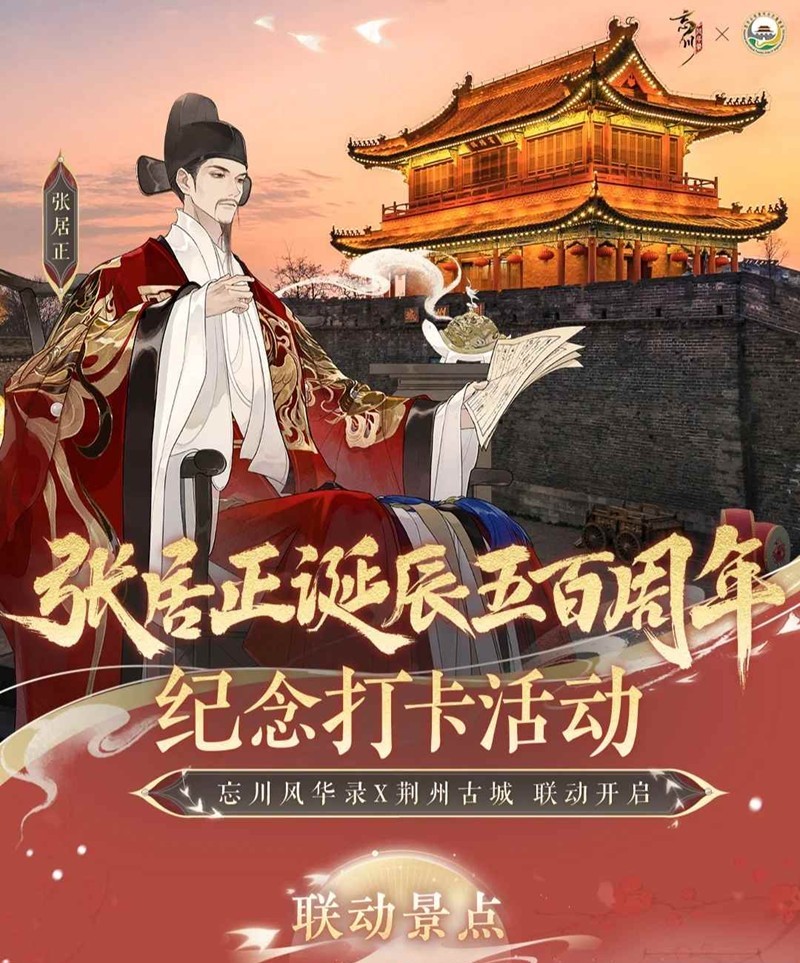 荆楚风流,共承忘川!多城联动打卡共庆张居正诞辰500周年活动——荆州站联动开启!忘川风华录携手荆州古城,推出张居正500周边诞辰线下联动打卡点,诚邀使君大人穿越千年城墙,探寻第一首辅张居正的治世传奇!