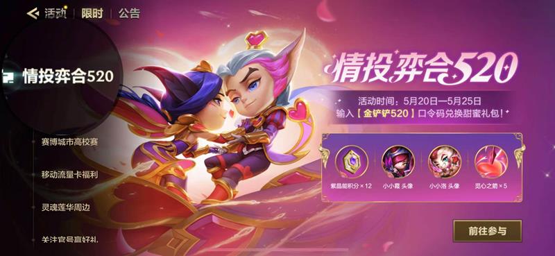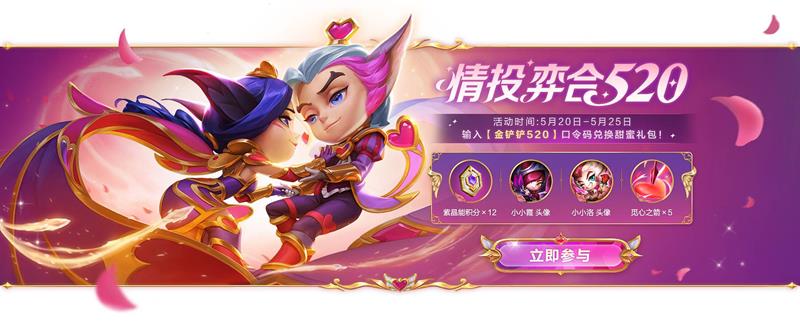 5月20日10点起至5月25日24点,前往游戏内-事件中心-限时-情投弈合520,通过口令码【金铲铲520】兑换甜蜜礼包快来参与吧!