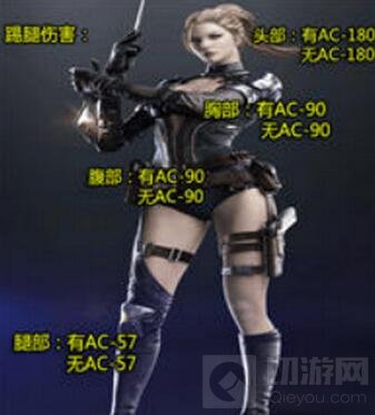 从伤害图可以看出,踢腿的伤害和暗影利刃的伤害相差不多,踢腿命中头部可以一击毙命,命中身体上半身可以造成90点伤害,命中下半身可以造成57点伤害。和暗影利刃一样审判者的踢腿也是无视AC的,所以说嘛英雄级人物就是霸气。