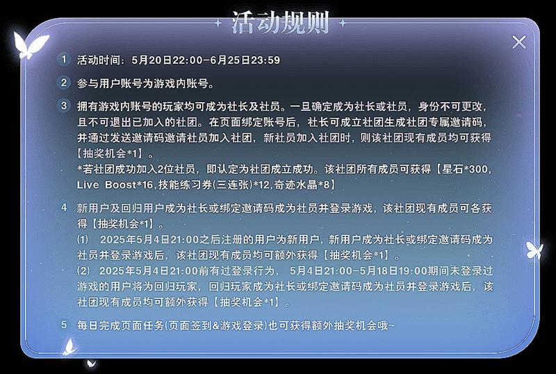 对于新加入游戏的玩家和回归玩家来说,只要创建社团或者使用邀请码加入现有社团并登录游戏,就能为社团所有成员带来额外奖励。当社团成功组建满三人时,每位成员都可以获得包括300星石、16个Live Boost、12张技能练习券和8个奇迹水晶在内的丰厚奖励。