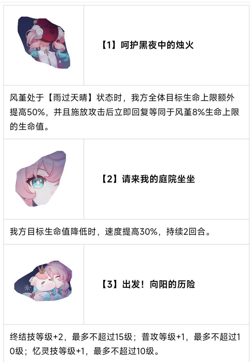 风堇1星魂能显著提升【雨过天晴】的治疗效果,生命上限加成额外提高50%。当风堇处于该状态时,队友每次攻击后都会立即回复等同于风堇8%生命值的血量。这个星魂大幅增强了队伍的持续作战能力,特别适合需要高频治疗的阵容。