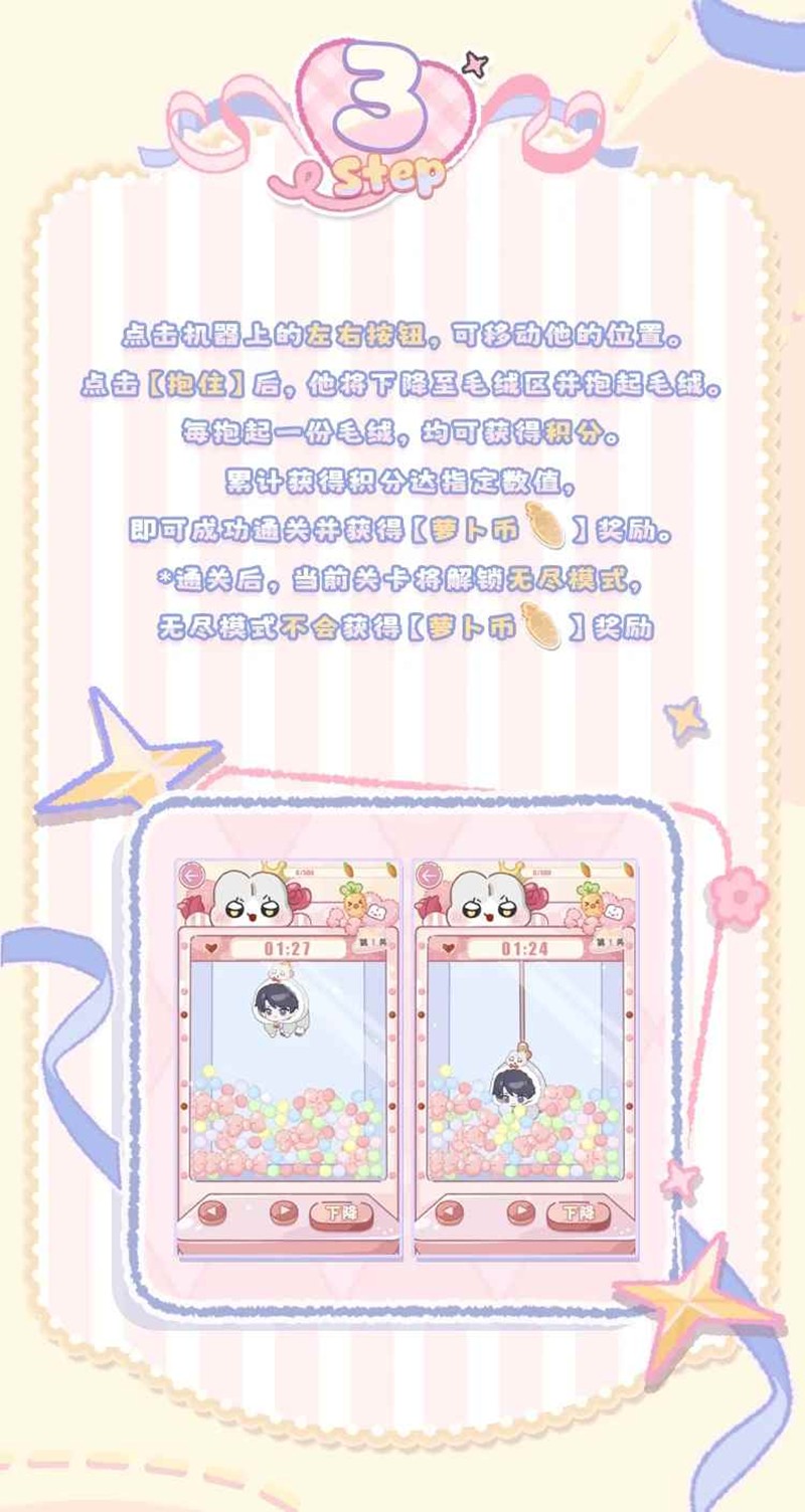 通过抱起毛绒获得积分并达到指定数值,即可成功通关并获得【萝卜币】奖励。