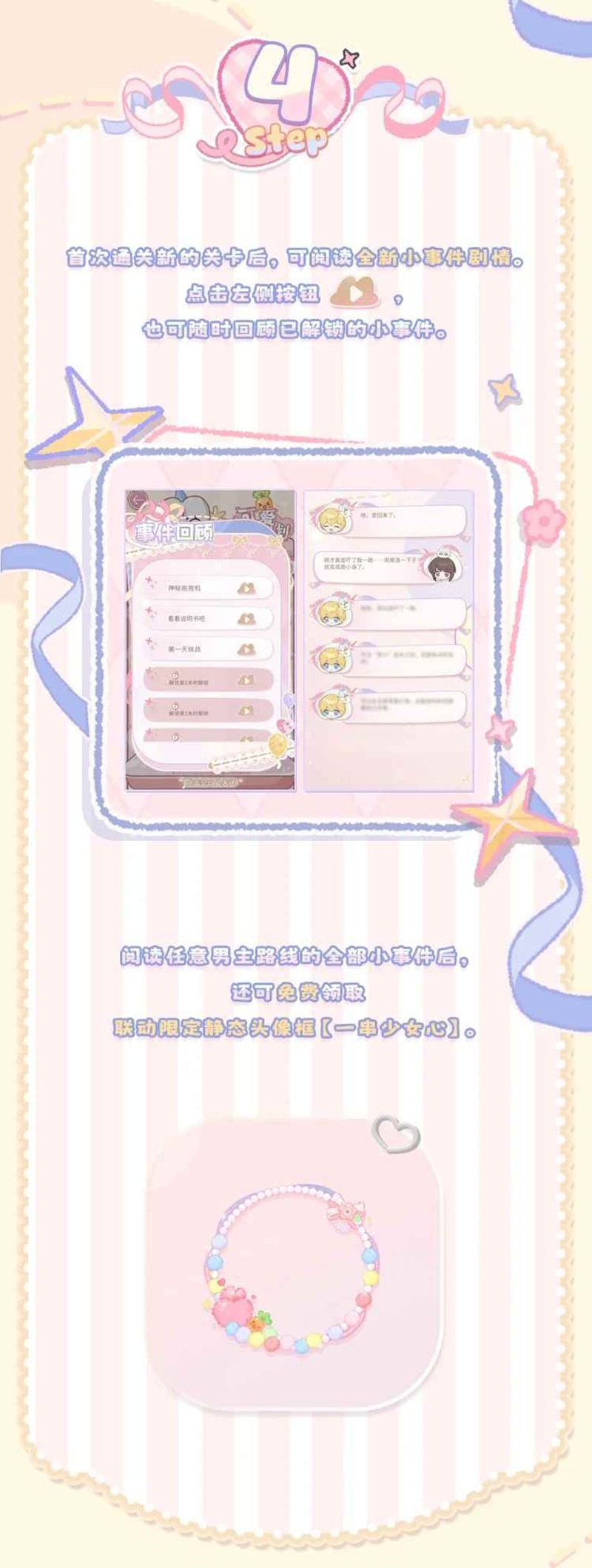 首次通关新的关卡后,可阅读全新小事件剧情。阅读任意男主路线的全部小事件后,还可免费领取联动限定静态头像框【一串少女心】。