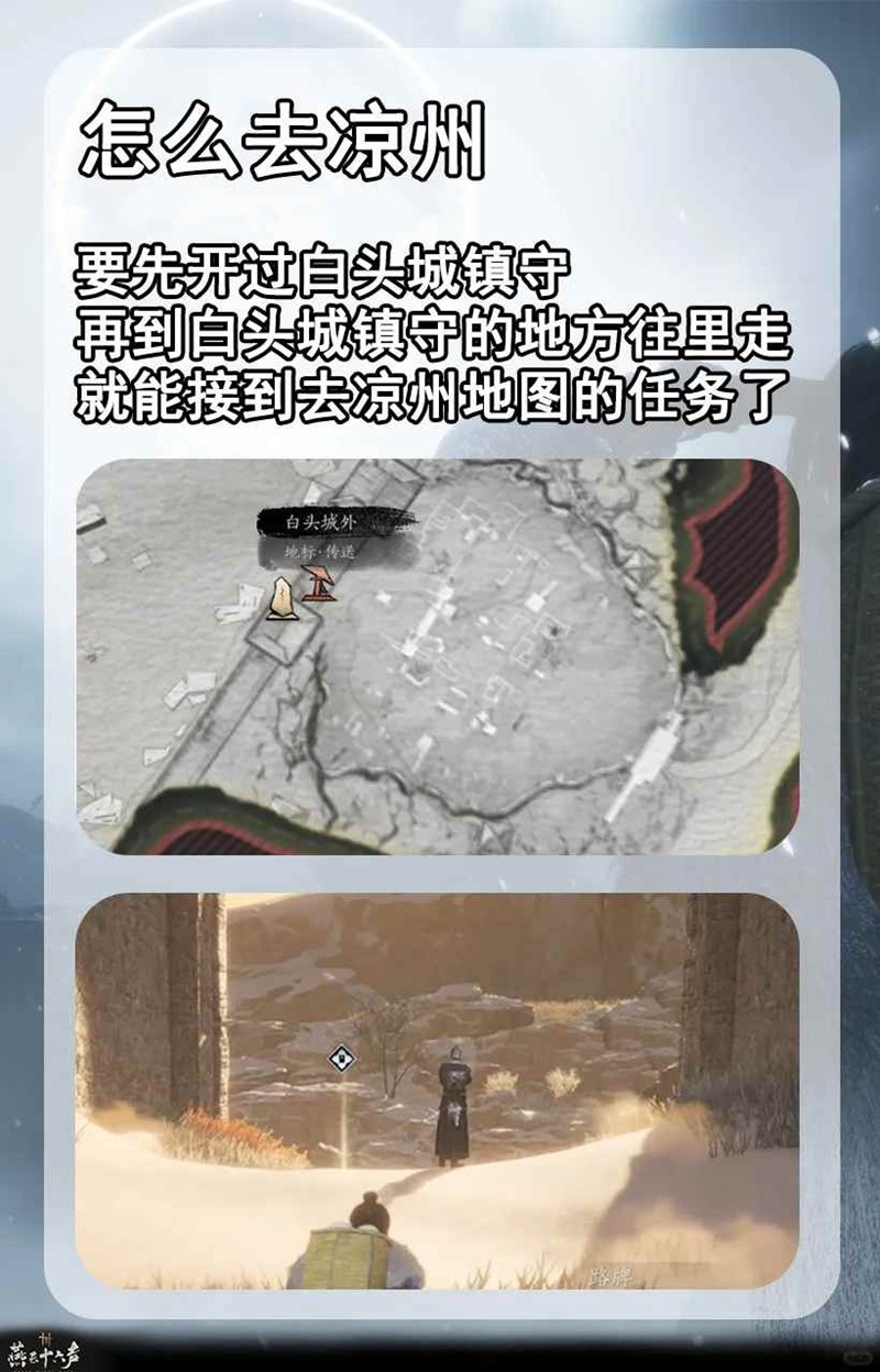 铁铁们想要去凉州地图,俺们需要先开过白头城镇守任务,然后到白头城镇守的地方往里走就能接到去凉州地图的任务了。