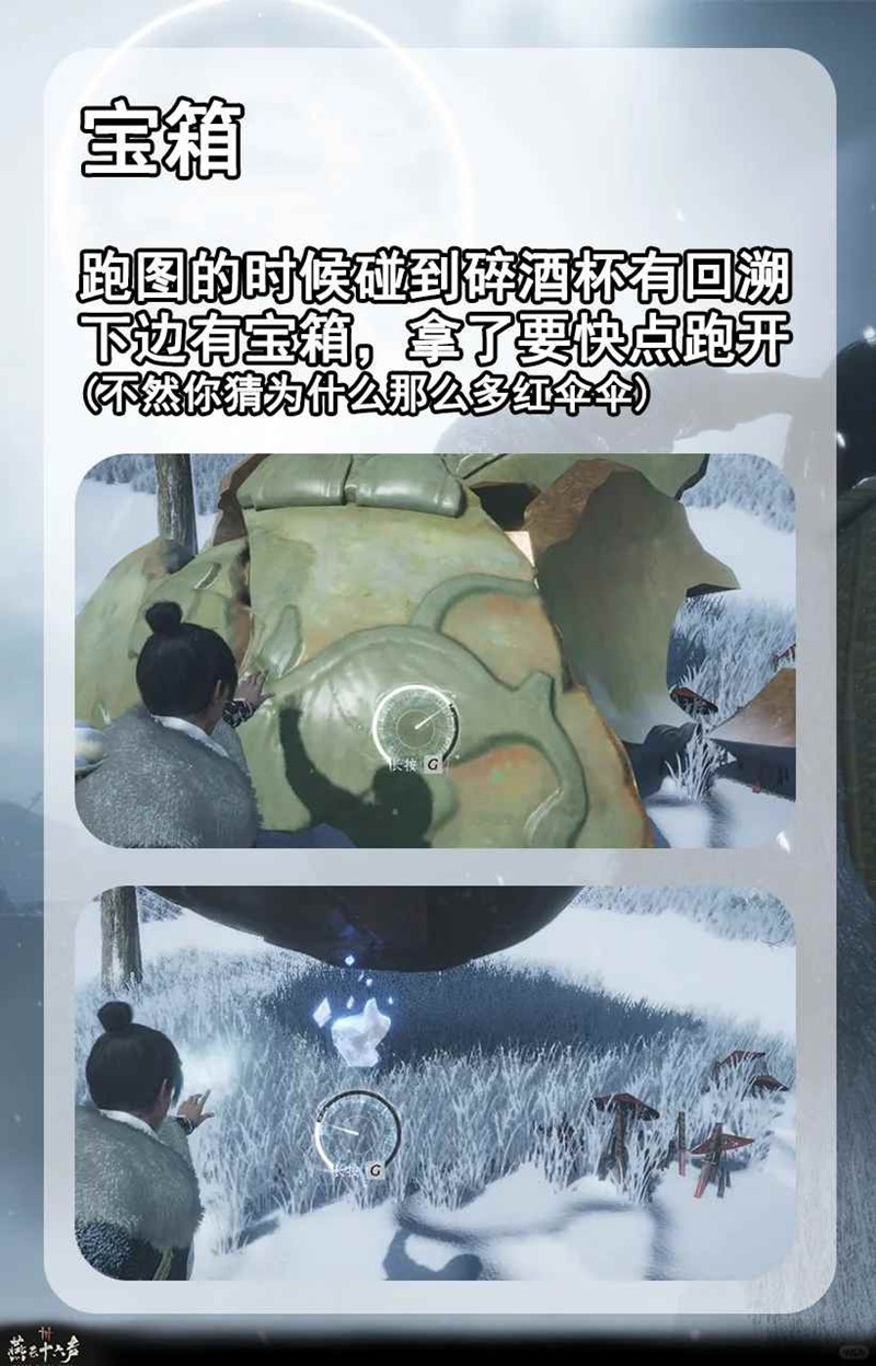 俺们在跑图的时候碰到碎酒杯有回溯按键的下边有宝箱,记得拿了快点跑开,不然铁铁就知道下面怎么有那么多红伞伞了。