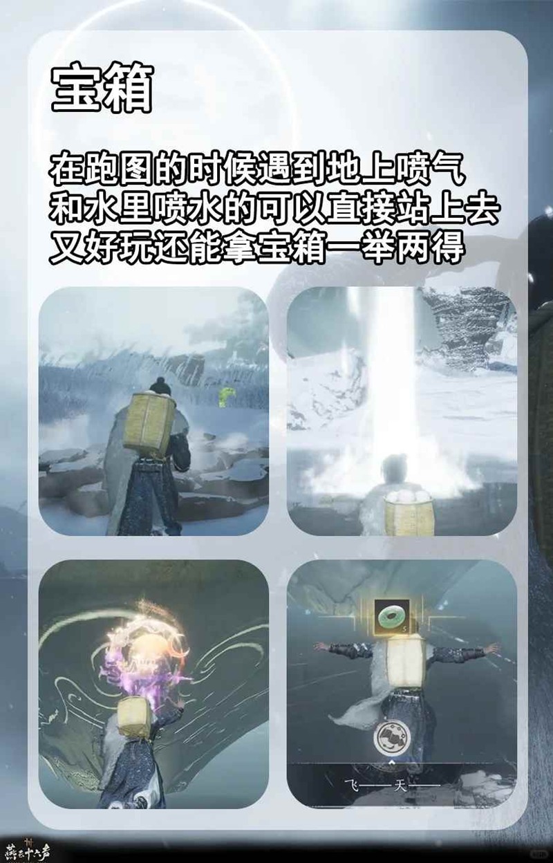 咱们在跑图的时候遇到地上有喷气和水里能喷水的可以直接往上一站,又好玩还能拿宝箱一举两得。