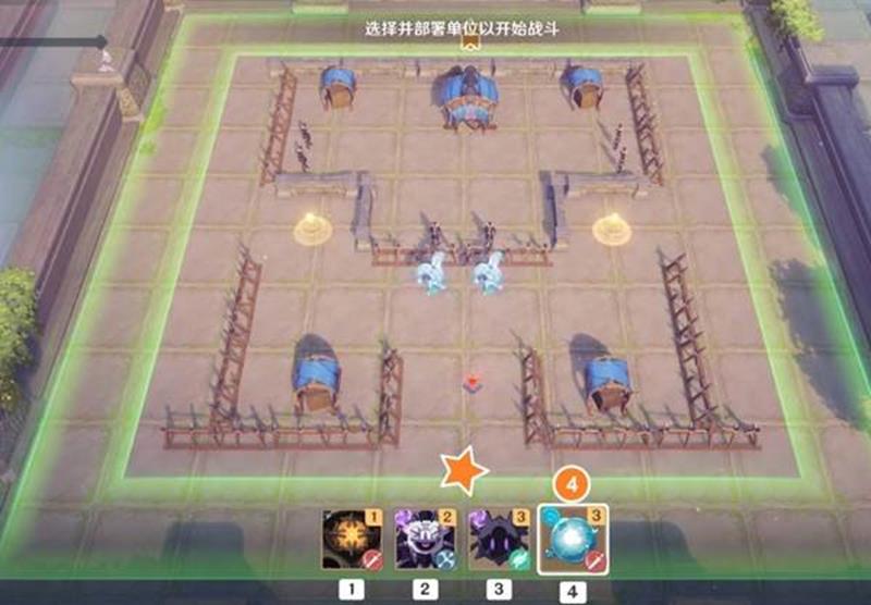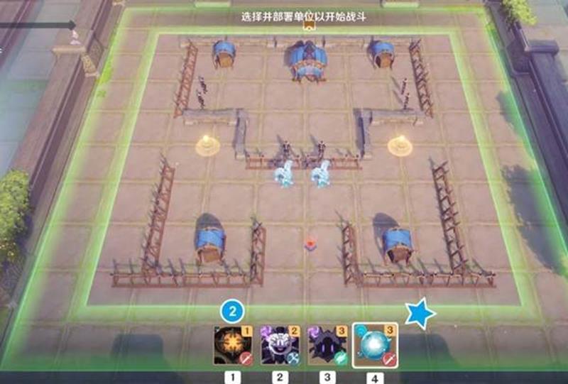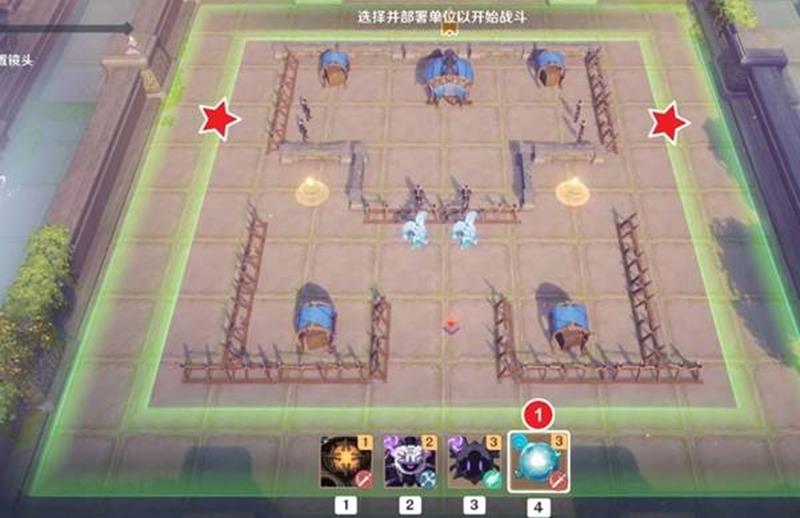 战斗开始前在界面左右两侧各部署2只水幻灵,右下角放置1只遗迹守卫。