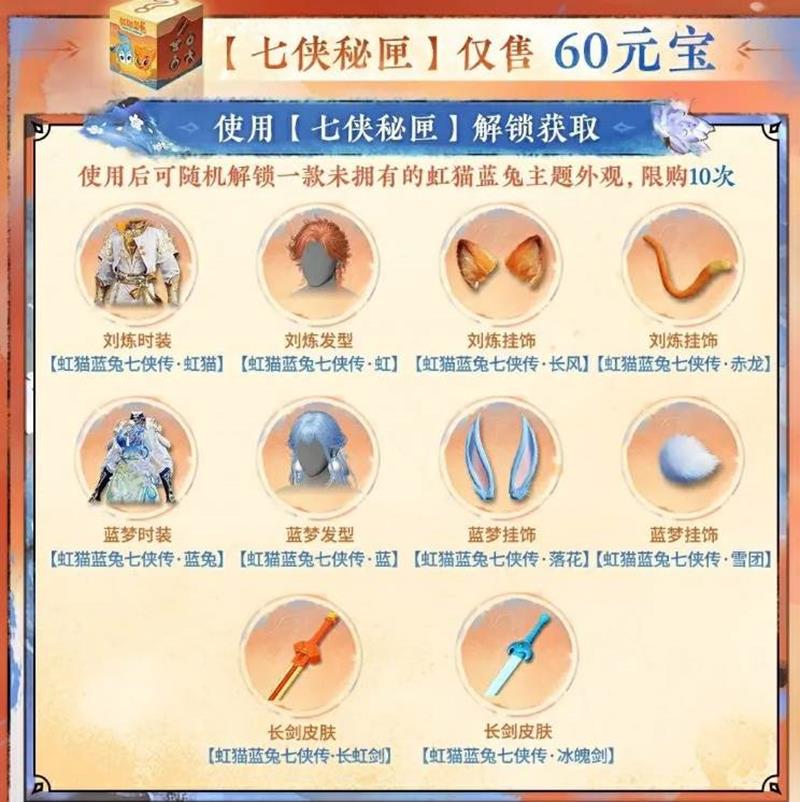 推出限时盲盒【七侠秘匣】,每款6元,全套仅需60元。集齐10款外观后,玩家还可额外领取虹猫经典杀招“火舞旋风”动作。