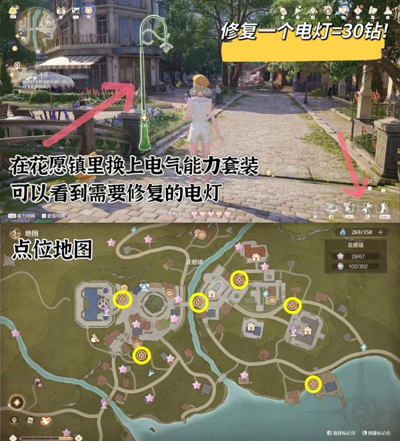 在花愿镇换上电气能力套装,可以看到镇子上坏掉的路灯