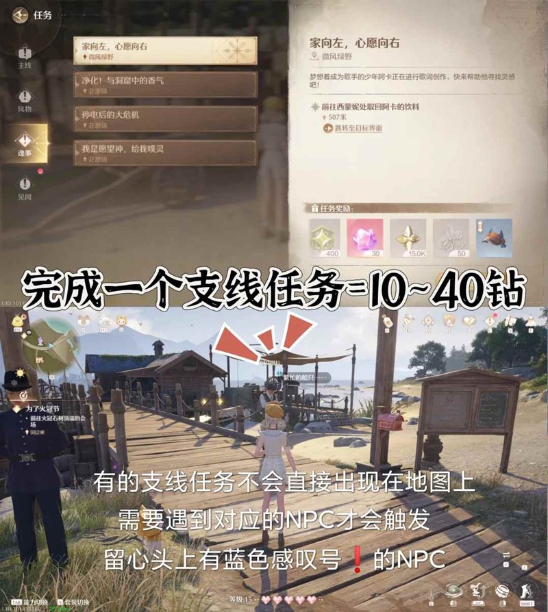 其次!完成各种支线任务可以获得10~40钻的奖励