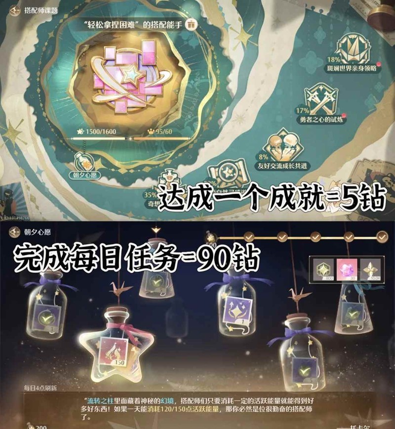 每达成一点成就给5钻前期一些简单的成就会比较容易完成,后面可以看看具体的成就要求,针对性地去做