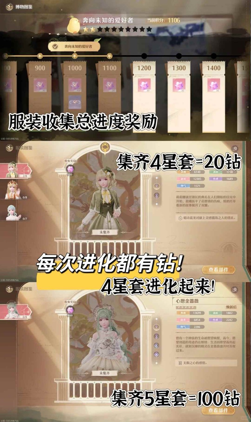 每升100点能给30钻每升1000点给100钻这里的收集度是套装和单品都会计算在内,所以单品图纸也要做噢