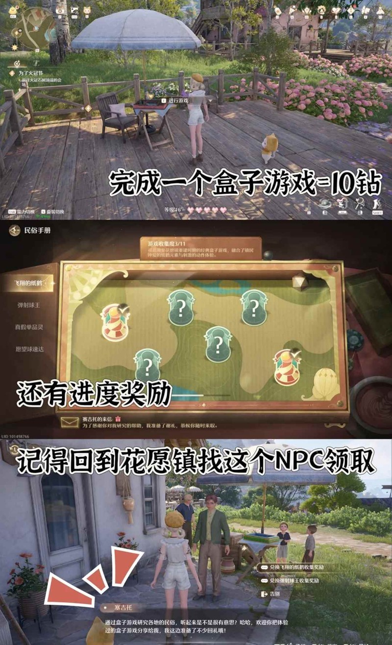 首先是盒子游戏,每完成一个可以拿10钻美鸭梨里面有有个【民宿手册】,里面是盒子游戏的收集进度