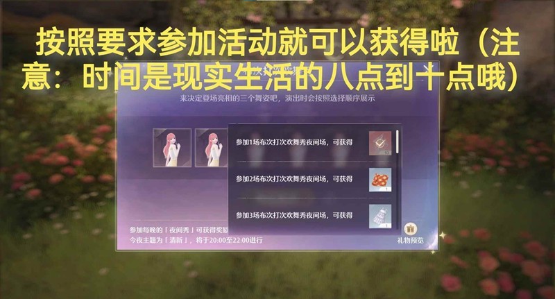 按照要求,参加活动就可以获得。注意:时间是现实生活的晚上八点到十点。现实生活的晚上八点,而且每天有效次数是一次,要好几天都去才能领完奖励。