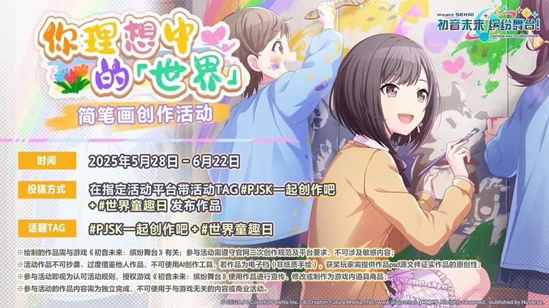 本次活动时间从 2025 年 5 月 28 日持续至 6 月 22 日。参与方式很简单,只需完成简笔画作品绘制,并带活动 tag #PJSK 一起创作吧 + #世界童趣日,公开发布至微博、小红书或 bilibili 平台个人主页,即视为成功参与活动。