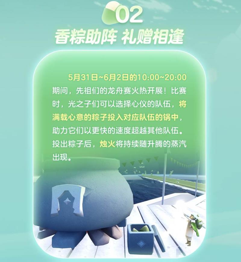 比赛期间,光之子们可以选择心仪的队伍,将粽子投入对应队伍的锅中助力。投出粽子后,烛火将持续随升腾的蒸汽出现。