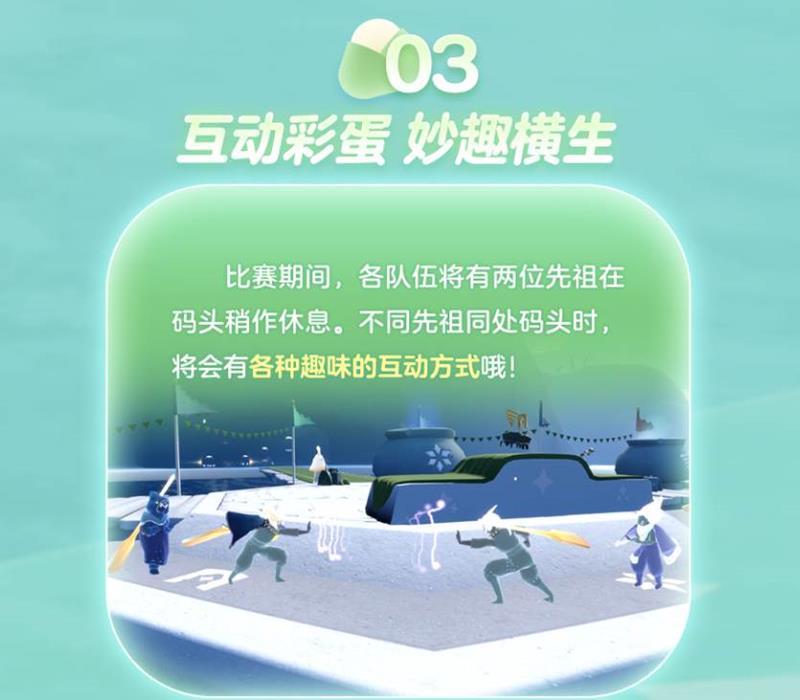 比赛期间,各队伍将有两位先祖在码头稍作休息,不同先祖同处码头时将会有各种趣味的互动方式。