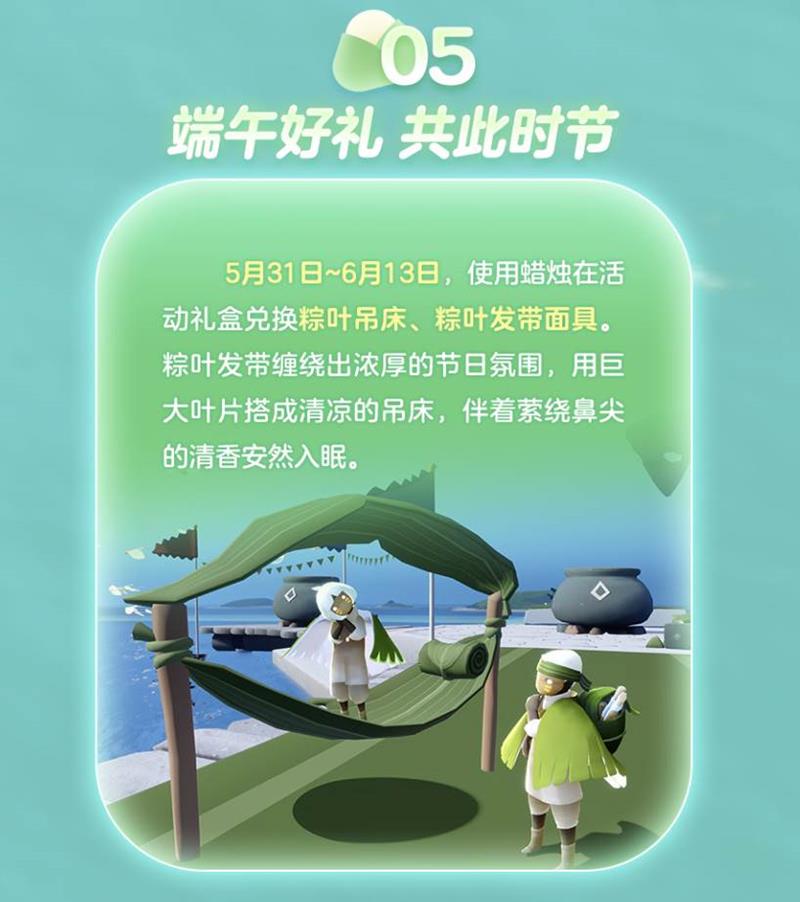 每天比赛结束后,老奶奶将会为全服光之子赠送谢礼。使用蜡烛在活动礼盒兑换粽叶吊床、粽叶发带面具等限定装扮。