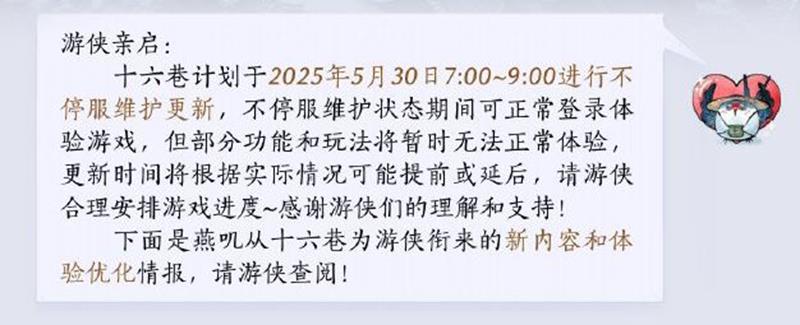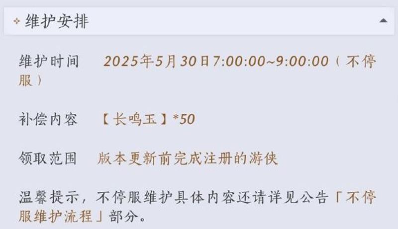 本次维护时间为 2025 年 5 月 30 日 7:00~9:00,属于不停服维护。版本更新前完成注册的游侠可在更新后领取补偿内容【长鸣玉】×50。