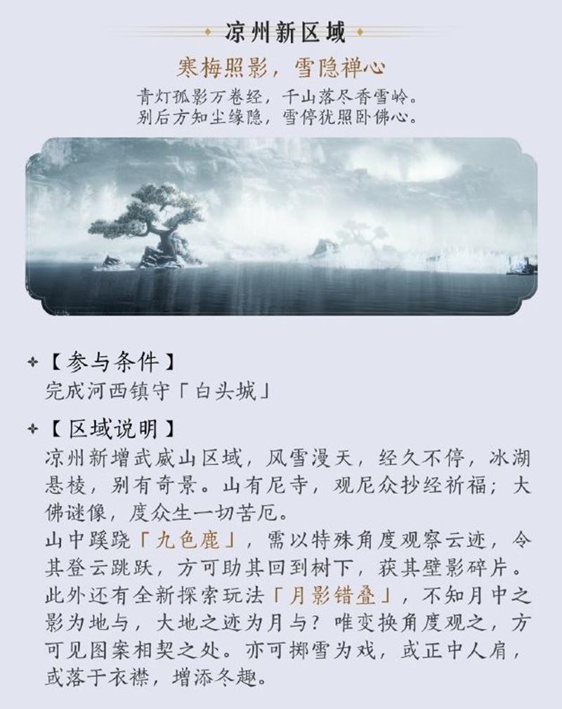 本次更新新增了凉州武威山区域。这是一个风雪漫天的山地,有着冰湖悬陵等奇景。这里有尼寺和大佛谜像,还有机会遇到名为 “天禄” 的仙鹿。山中还有 “九色鹿” 可供寻找,成功找到并助其回到树下可获得壁影碎片。此外,还有全新探索玩法 “月影错叠”,为游侠们带来全新的探索体验。