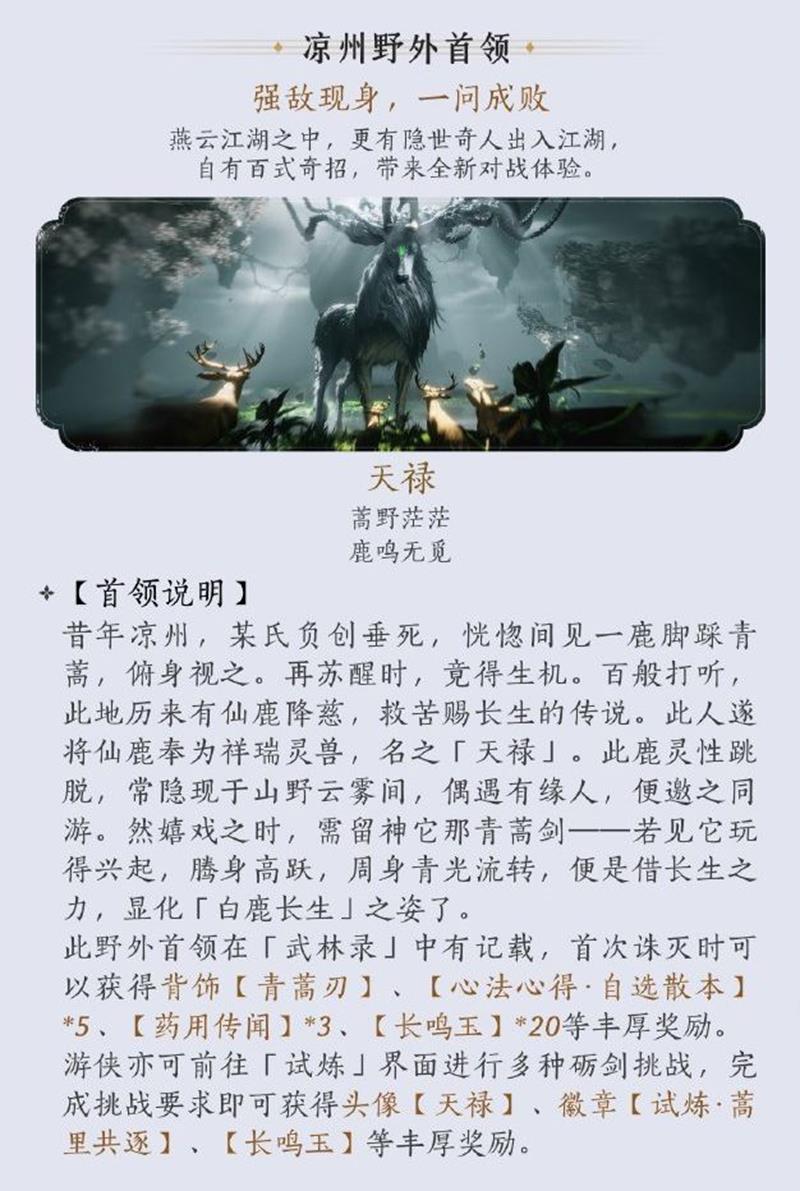 更新后将出现凉州野外首领。击败首领可获得背饰【青蒿刃】、心法心得・自选散本 ×5、药用传闻 ×3、长鸣玉 ×20 等奖励。游侠还可以在 “试炼” 界面参与多种砺剑挑战,完成挑战要求可获得头像【天禄】、徽章【试炼・蒿里共逐】、长鸣玉等丰厚奖励。