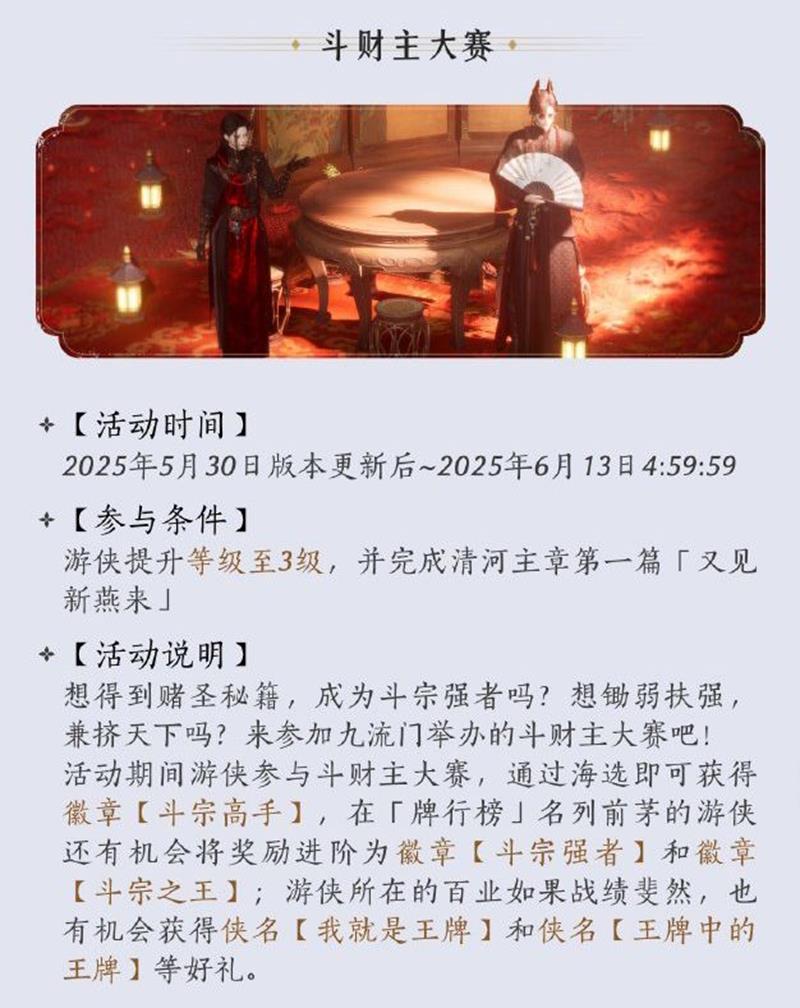 活动说明:参与斗财主大赛,有机会获得多种徽章和侠名奖励。