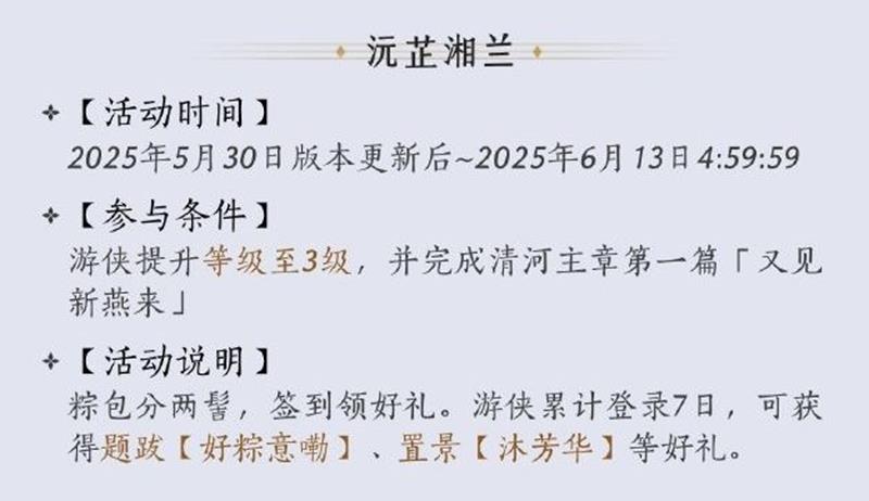活动说明:游侠累计登录 7 日可获得题跋【好粽意嘞】、置景【沐芳华】等好礼。