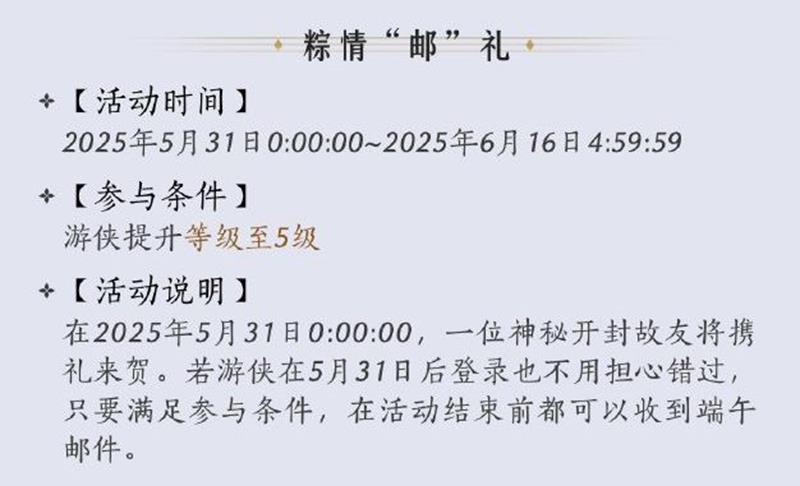 活动说明:神秘开封故友将携礼来贺,满足条件的游侠在活动结束后可收到端午邮件。