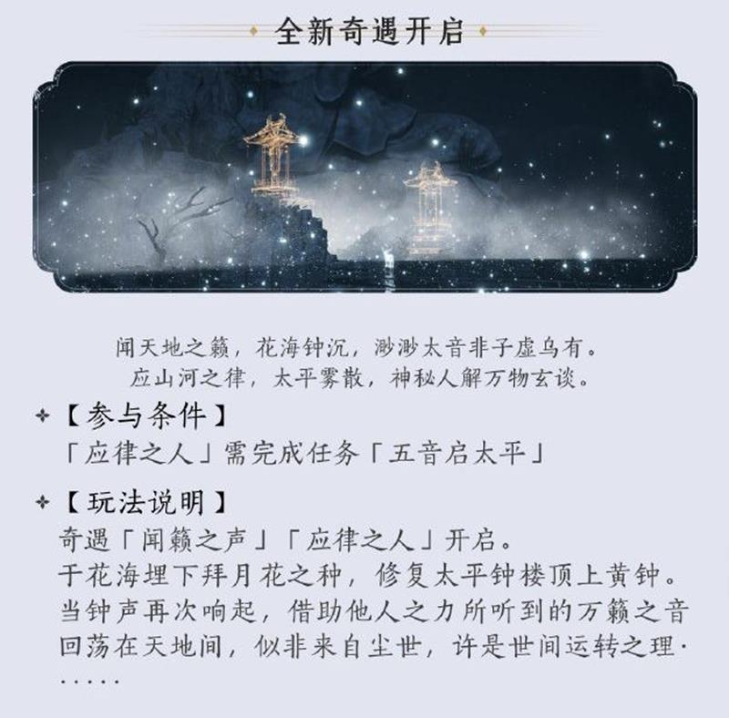 新增奇遇 “闻籁之声”“应律之人”,游侠完成任务 “五音启太平” 后可参与。