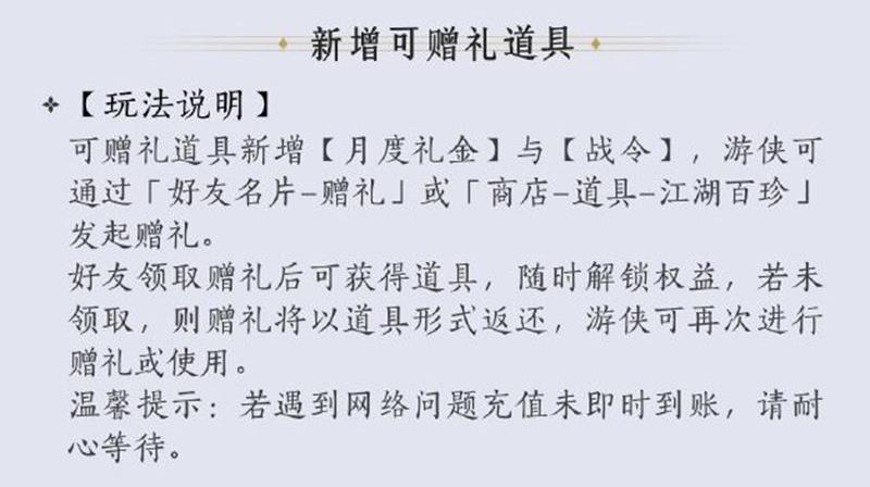 可赠礼道具新增【月度礼金】与【战令】,游侠可通过多种方式发起赠礼。