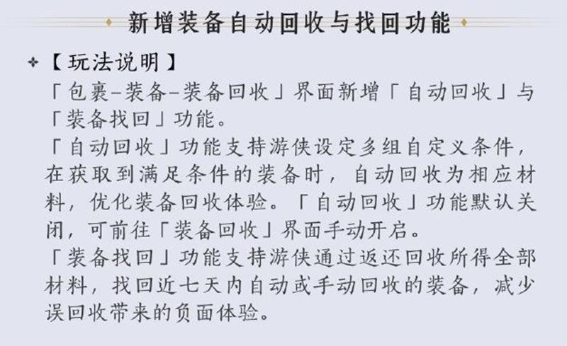 “包裹 - 装备 - 装备回收” 界面新增 “自动回收” 与 “装备找回” 功能,优化装备回收体验。