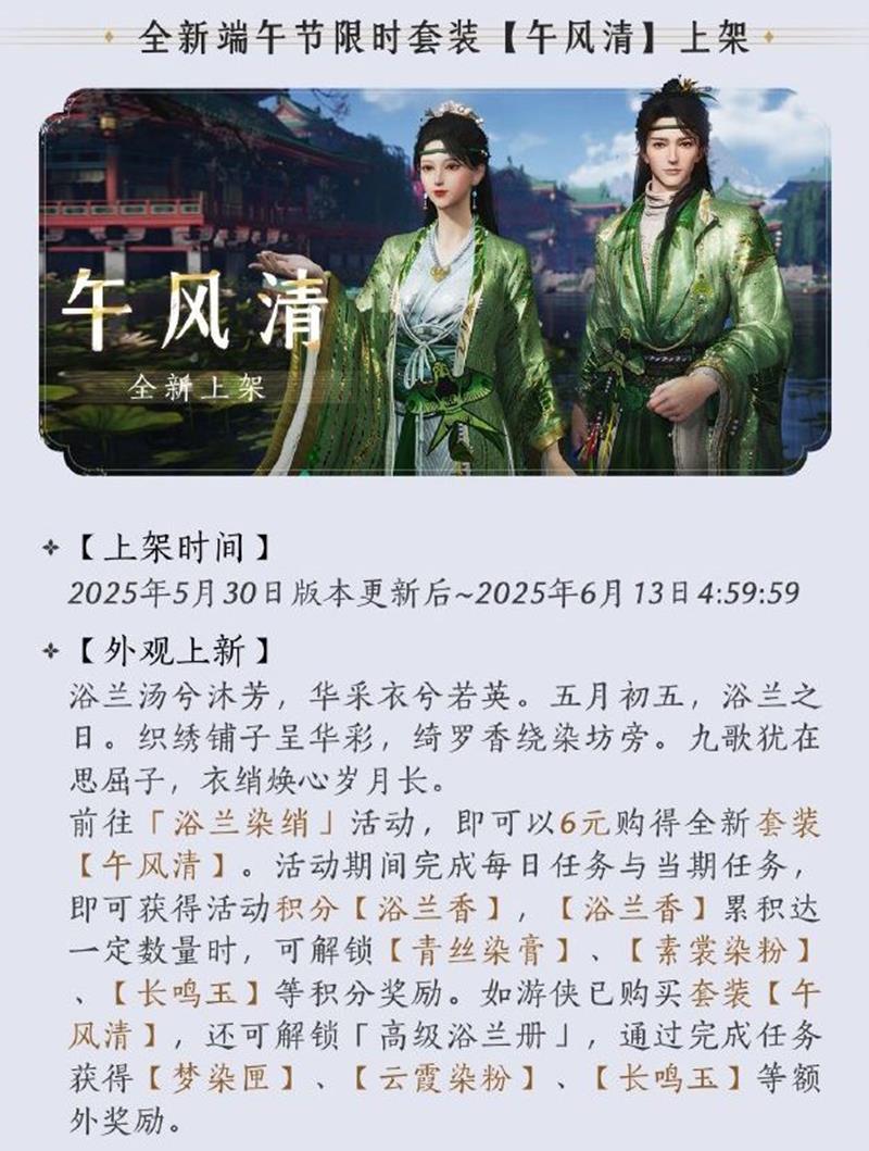 游侠可参与 “浴兰染绡” 活动,以 6 元购得全新套装【午风清】,并完成任务解锁多种奖励。