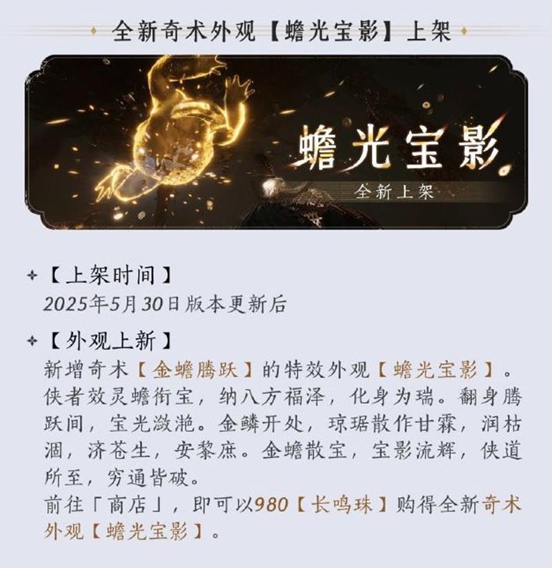 游侠可前往 “商店”,以 980 长鸣珠购得全新奇术外观【蟾光宝影】。