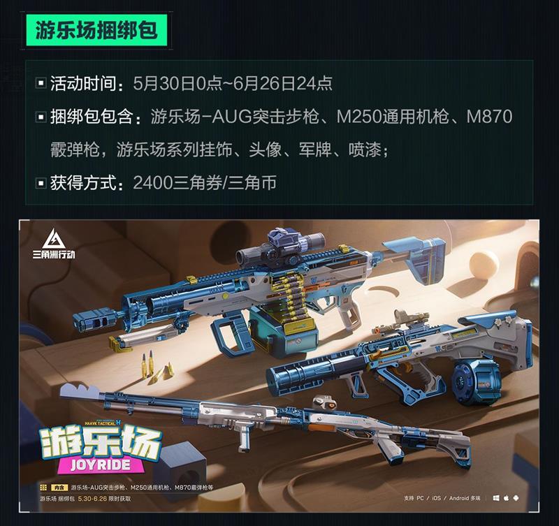 活动时间为 5 月 30 日 0 点至 6 月 26 日 24 点。捆绑包包含游乐场 - AUG 突击步枪、M250 通用机枪、M870 霰弹枪,以及游乐场系列挂饰、头像、军牌、喷漆等。获得方式为 2400 三角券 / 三角币。