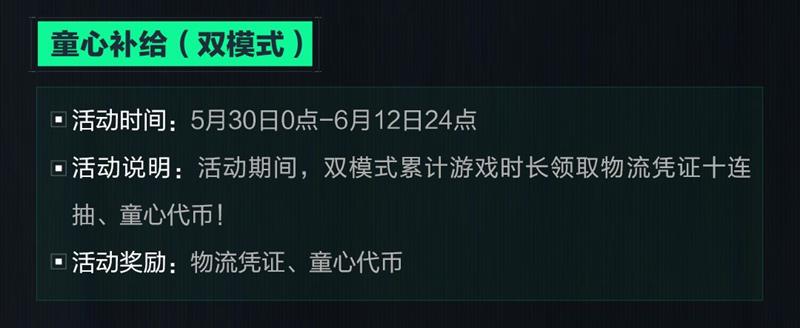 活动时间为 5 月 30 日 0 点至 6 月 12 日 24 点。活动期间,双模式累计游戏时长领取物流凭证十连抽、童心代币。活动奖励为物流凭证、童心代币。