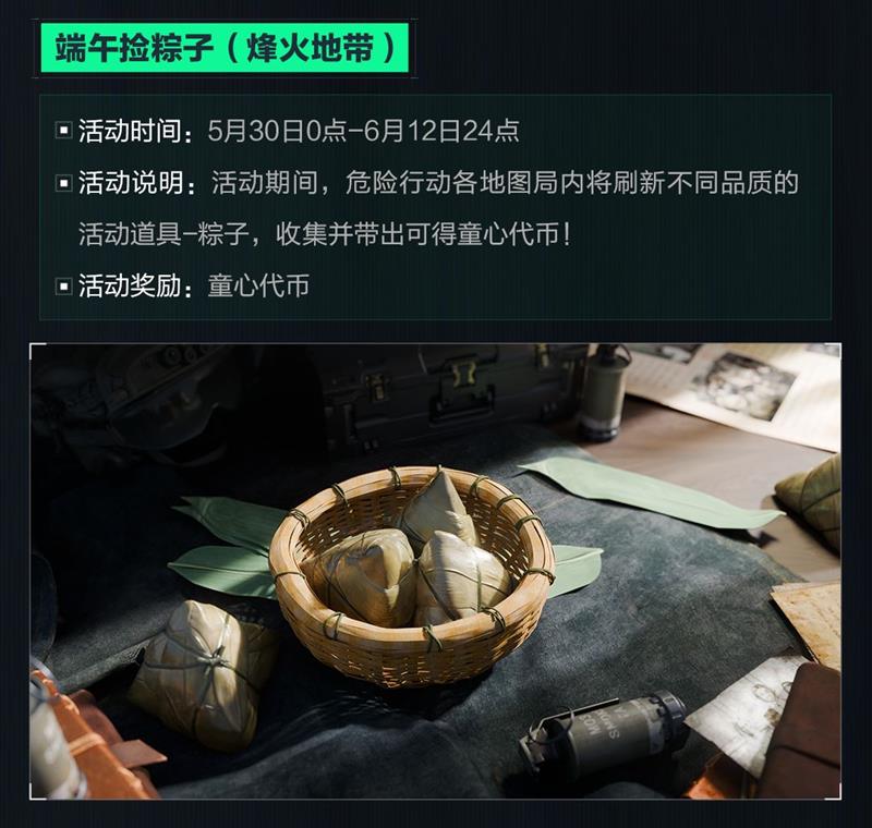 活动时间为 5 月 30 日 0 点至 6 月 12 日 24 点。活动期间,危险行动各地图局内将刷新不同品质的活动道具 - 粽子,收集并带出可得童心代币。活动奖励为童心代币。