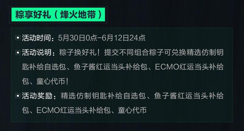 活动时间为 5 月 30 日 0 点至 6 月 12 日 24 点。粽子换好礼!提交不同组合粽子可兑换精选仿制钥匙补给自选包、鱼子酱红运当头补给包、ECMO 红运当头补给包、童心代币。活动奖励包括精选仿制钥匙补给自选包、鱼子酱红运当头补给包、ECMO 红运当头补给包、童心代币。