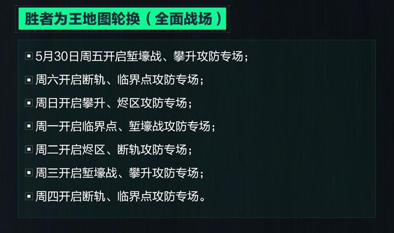 5 月 30 日周五开启堑壕战、攀升攻防专场;周六开启断轨、临界点攻防专场;周日开启攀升、烬区攻防专场;周一开启临界点、堑壕战攻防专场;周二开启烬区、断轨攻防专场;周三开启堑壕战、攀升攻防专场;周四开启断轨、临界点攻防专场。