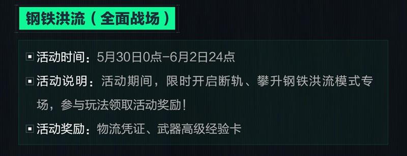 活动时间为 5 月 30 日 0 点至 6 月 2 日 24 点。活动期间,限时开启断轨、攀升钢铁洪流模式专场,参与玩法领取活动奖励!活动奖励为物流凭证、武器高级经验卡。