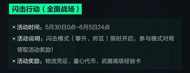 活动时间为 5 月 30 日 0 点至 6 月 5 日 24 点。闪击模式(攀升、烬区)限时开启,参与模式对局领取活动奖励!活动奖励包括物流凭证、童心代币、武器高级经验卡。