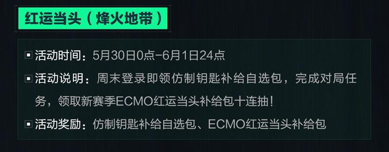 活动时间为 5 月 30 日 0 点至 6 月 1 日 24 点。周末登录即领仿制钥匙补给自选包,完成对局任务,领取新赛季 ECMO 红运当头补给包十连抽!活动奖励包括仿制钥匙补给自选包、ECMO 红运当头补给包。