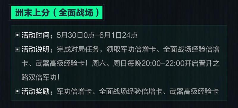 活动时间为 5 月 30 日 0 点至 6 月 1 日 24 点。完成对局任务,领取军功倍增卡、全面战场经验倍增卡、武器高级经验卡!周六、周日每晚 20:00-22:00 开启攀升之路双倍军功!活动奖励包括军功倍增卡、全面战场经验倍增卡、武器高级经验卡。